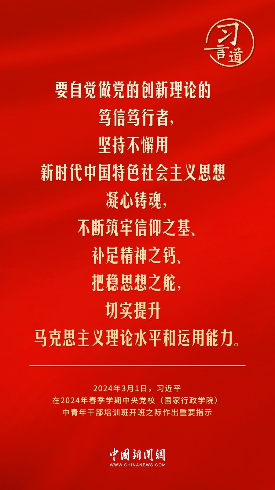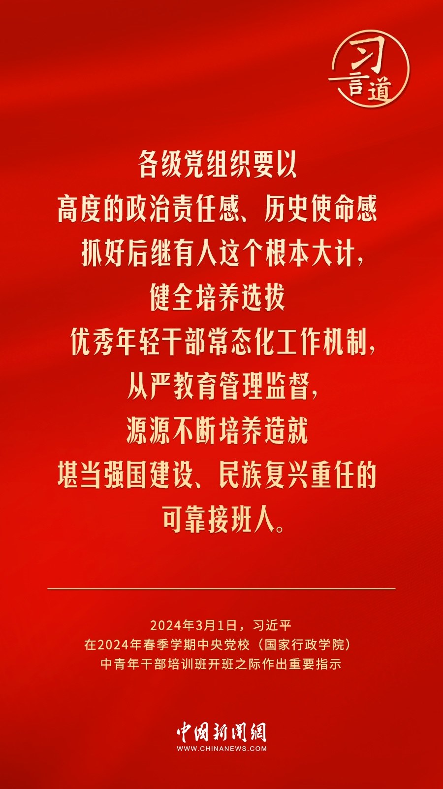 2024年春季學(xué)期中央黨校(國家行政學(xué)院)中青年干部培訓(xùn)班3月1日上午在中央黨校開班。中共中央總書記、國家主席、中央軍委主席習(xí)近平作出重要指示,他強(qiáng)調(diào)——