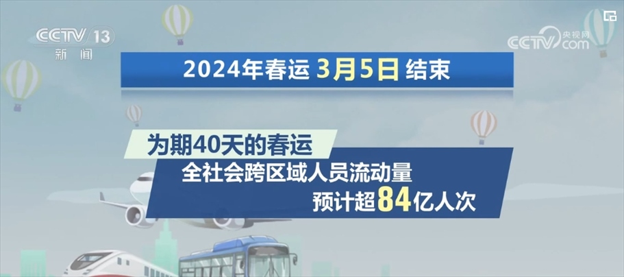 2024年春運(yùn)3月5日結(jié)束,為期40天的春運(yùn)全社會跨區(qū)域人員流動量預(yù)計(jì)超84億人次。其中,鐵路客運(yùn)量預(yù)計(jì)完成4.8億人次;公路人員流動量預(yù)計(jì)完成78.3億人次,其中,高速公路及普通國省道非營業(yè)性小客車人員出行量預(yù)計(jì)完成67.2億人次,在全社會跨區(qū)域人員流動量中占比約80%,公路營業(yè)性客運(yùn)量預(yù)計(jì)完成11.1億人次;水路客運(yùn)量預(yù)計(jì)完成2900萬人次;民航客運(yùn)量預(yù)計(jì)完成8300萬人次。