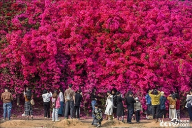 2024年3月8日,廣東惠州仲愷區(qū)潼湖鎮(zhèn)的一處古村落魚(yú)塘邊現(xiàn)百米長(zhǎng)簕杜鵑花墻,吸引游客爭(zhēng)相拍照。