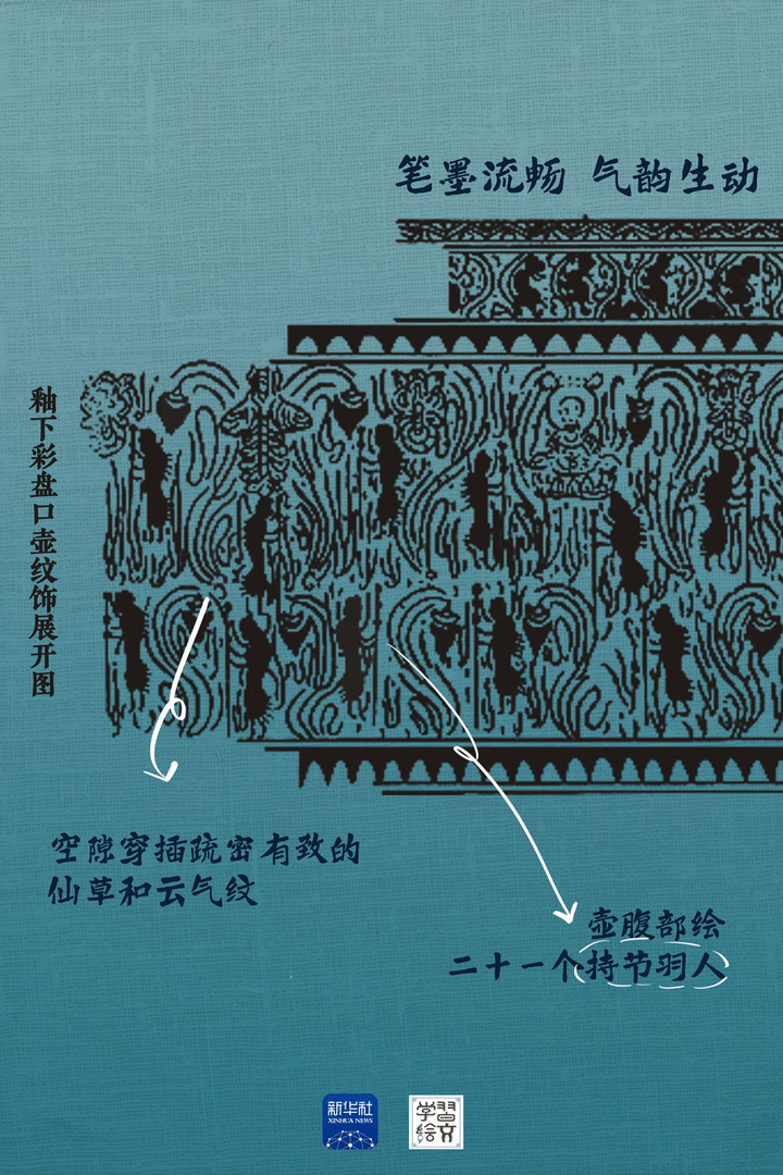 “這件藏于六朝博物館的青瓷釉下彩羽人紋盤口壺于1983年出土,精湛的釉下彩繪工藝,改變了人們對(duì)釉下彩工藝始于唐代的認(rèn)識(shí),把我國(guó)釉下彩繪工藝出現(xiàn)的時(shí)間提前了近五百年。”宋燕說(shuō)。