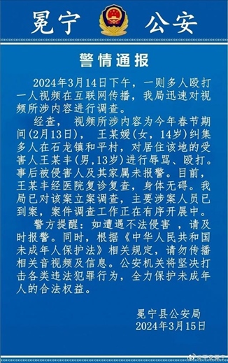 ·警方通報男孩跪地遭多名男女毆打:受害者無礙,主要涉案人員已到案。