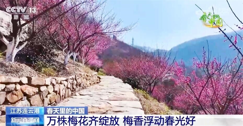 春日暖陽中,江蘇連云港花果山漫山遍野的梅花悄然綻放,紅梅花開似海、明媚驚艷,遠看如云霞燦爛,近聞有盈袖暗香。花果山梅園經(jīng)過多年的栽植培育,有紅梅、美人梅、綠萼梅等梅樹2萬多株。