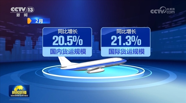 貨運(yùn)方面,2月,全行業(yè)完成貨郵運(yùn)輸量54.6萬噸,同比增長20.8%。其中,國內(nèi)、國際貨運(yùn)規(guī)模同比分別增長20.5%、21.3%。1—2月貨郵運(yùn)輸量達(dá)到歷年開年前兩月最高值。