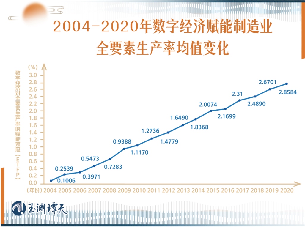 有學(xué)者做過測算,從2004年開始到2021年,數(shù)字經(jīng)濟賦能制造業(yè)全要素生產(chǎn)率效能呈逐年上升的趨勢,且近年來,賦能均值達到了最高點。
