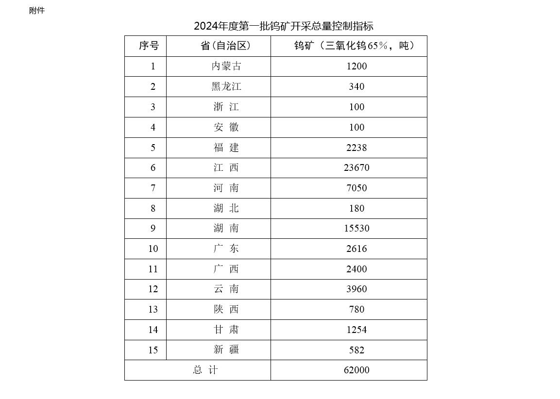 自然資源部:2024年度第一批鎢礦開采總量控制指標為62000噸