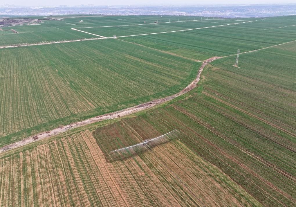 3月6日,在西安市長安區(qū)神禾塬萬畝優(yōu)質(zhì)糧食生產(chǎn)基地,長豐農(nóng)機(jī)專業(yè)合作社使用淋灌機(jī)澆灌小麥(無人機(jī)照片)。新華社記者邵瑞 攝