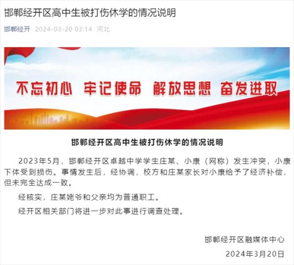 ·河北邯鄲一學(xué)生被同學(xué)打傷睪丸休學(xué),打人者自稱姥爺是縣長,當(dāng)?shù)赝▓蟆?/p>