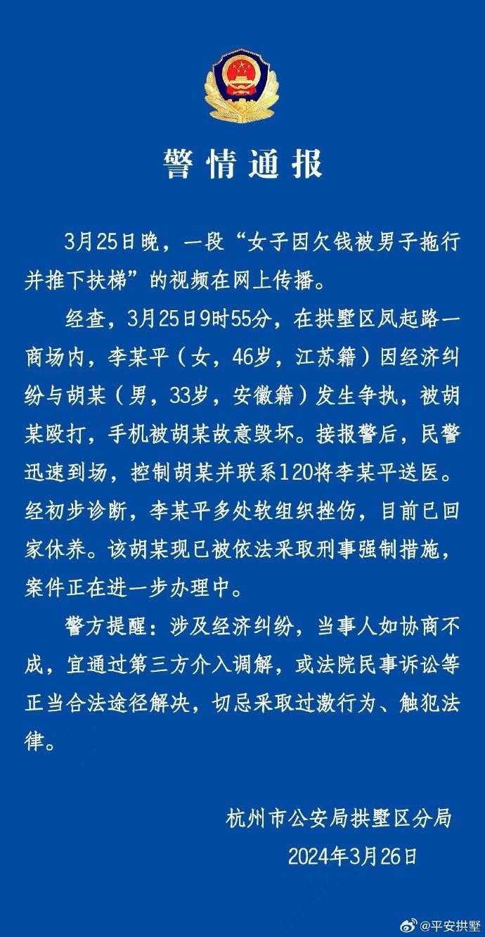 女子欠錢被男子拖下扶梯?杭州警方:涉經(jīng)濟糾紛 切忌采取過激行為