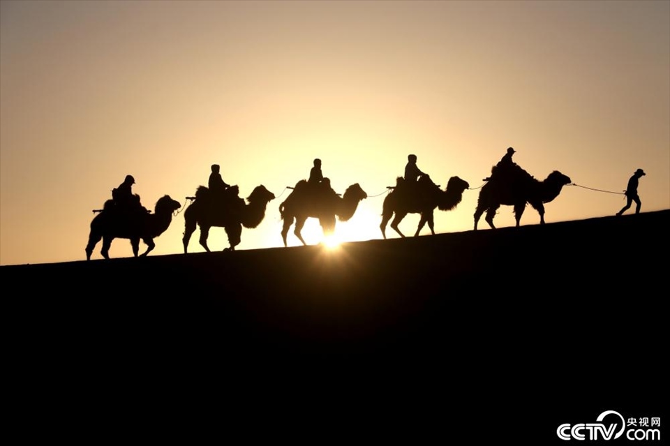 27日,甘肅敦煌,鳴沙山月牙泉景區(qū)晨光如畫,游客觀賞大漠日出,乘騎駱駝體驗絲路風(fēng)情。