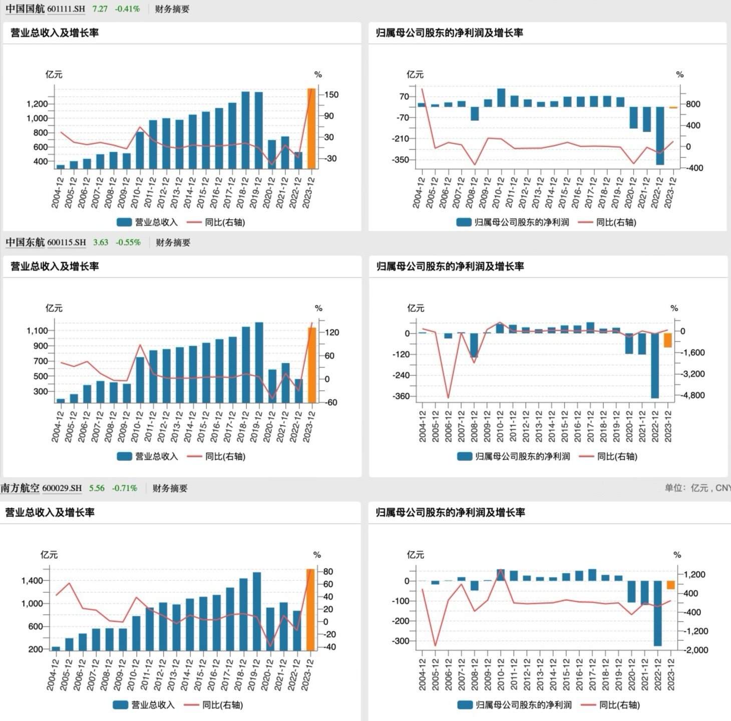 總體來(lái)看,三大航2023年業(yè)績(jī)集體仍未實(shí)現(xiàn)扭虧,但整體經(jīng)營(yíng)業(yè)績(jī)上有明顯改善,營(yíng)收均實(shí)現(xiàn)倍增恢復(fù)。去年前三季度業(yè)績(jī)亮眼,多項(xiàng)數(shù)據(jù)創(chuàng)新很高,但去年第四季度屬于傳統(tǒng)民航客運(yùn)淡季,其間不少航線價(jià)格都會(huì)環(huán)比大幅回落。具體來(lái)看航司業(yè)績(jī),南方航空去年?duì)I收最高,達(dá)到了1599.29億元,國(guó)航其次,營(yíng)收為1411億元,東航營(yíng)收為1137.41億元,分別同比增長(zhǎng)超八成、增超1.6倍、增超1.4倍。值得注意的是,其中國(guó)航和南航去年?duì)I收已創(chuàng)歷史新高。
