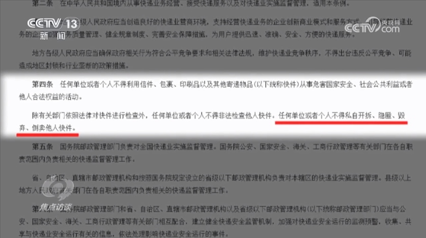 國務(wù)院頒布的《快遞暫行條例》第四條明確規(guī)定:“任何單位或者個(gè)人不得私自開拆、隱匿、毀棄、倒賣他人快件。”