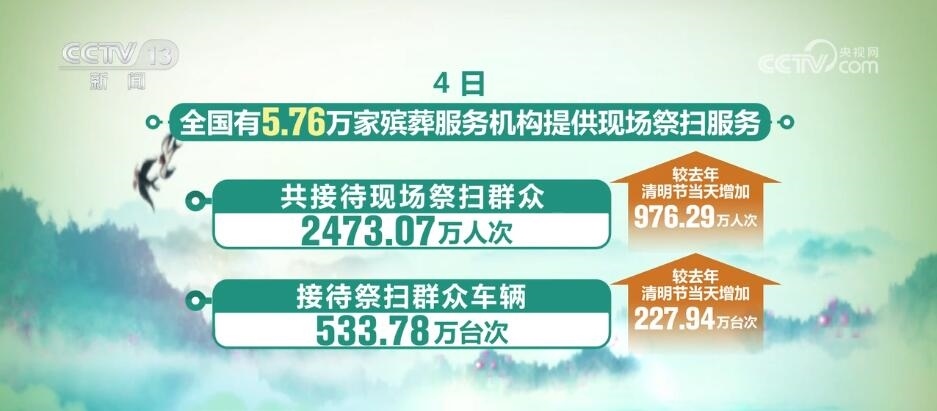 4日,全國有5.76萬家殯葬服務(wù)機(jī)構(gòu)提供現(xiàn)場祭掃服務(wù),共接待現(xiàn)場祭掃群眾2473.07萬人次,接待祭掃群眾車輛533.78萬臺次,較去年清明節(jié)當(dāng)天分別增加976.29萬人次和227.94萬臺次,其中選擇綠色低碳祭掃方式的群眾1712.97萬人次,占現(xiàn)場祭掃總?cè)藬?shù)的69.26%。