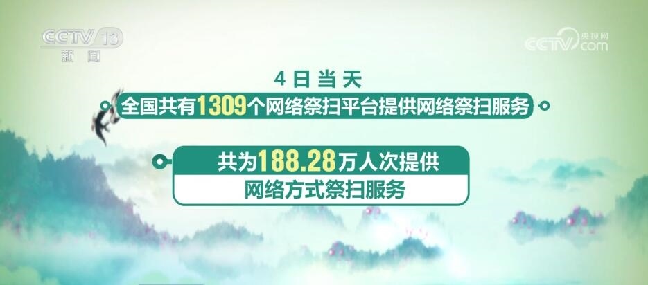 另外,4月4日當(dāng)天全國共有1309個網(wǎng)絡(luò)祭掃平臺提供網(wǎng)絡(luò)祭掃服務(wù),共為188.28萬人次提供網(wǎng)絡(luò)方式祭掃服務(wù)。
