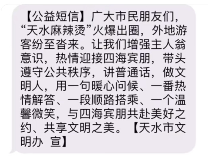 事實(shí)上,自3月以來(lái)天水在網(wǎng)絡(luò)“出圈”后,游客就絡(luò)繹不絕。有多位當(dāng)?shù)鼐W(wǎng)友“曬”的消息顯示,3月20日收到天水市發(fā)布的“公益短信”,建議當(dāng)?shù)厥忻瘛霸鰪?qiáng)主人翁意識(shí),熱情迎接四海賓朋……用一句暖心問(wèn)候、一番熱情解答、一段順路搭乘、一個(gè)溫馨微笑,與四海賓朋共赴美好之約……”