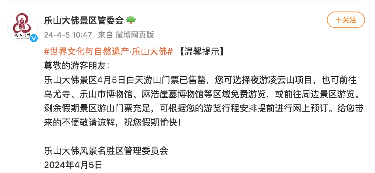 而據(jù)樂(lè)山大佛景區(qū)管委會(huì)發(fā)布的公告,4月4日15:04,樂(lè)山大佛景區(qū)當(dāng)日的白天游山門(mén)票已售罄;4月5日10:47,樂(lè)山大佛景區(qū)當(dāng)日的白天游山門(mén)票就已售罄。