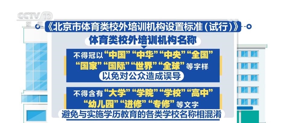 試行標(biāo)準(zhǔn)規(guī)定,體育類校外培訓(xùn)機(jī)構(gòu)名稱不得冠以“中國”“中華”“中央”“全國”“國家”“國際”“世界”“全球”等字樣,以免對公眾造成誤導(dǎo);不得含有“大學(xué)”“學(xué)院”“學(xué)校”“高中”“幼兒園”“進(jìn)修”“專修”等文字,避免與實施學(xué)歷教育的各類學(xué)校名稱相混淆。