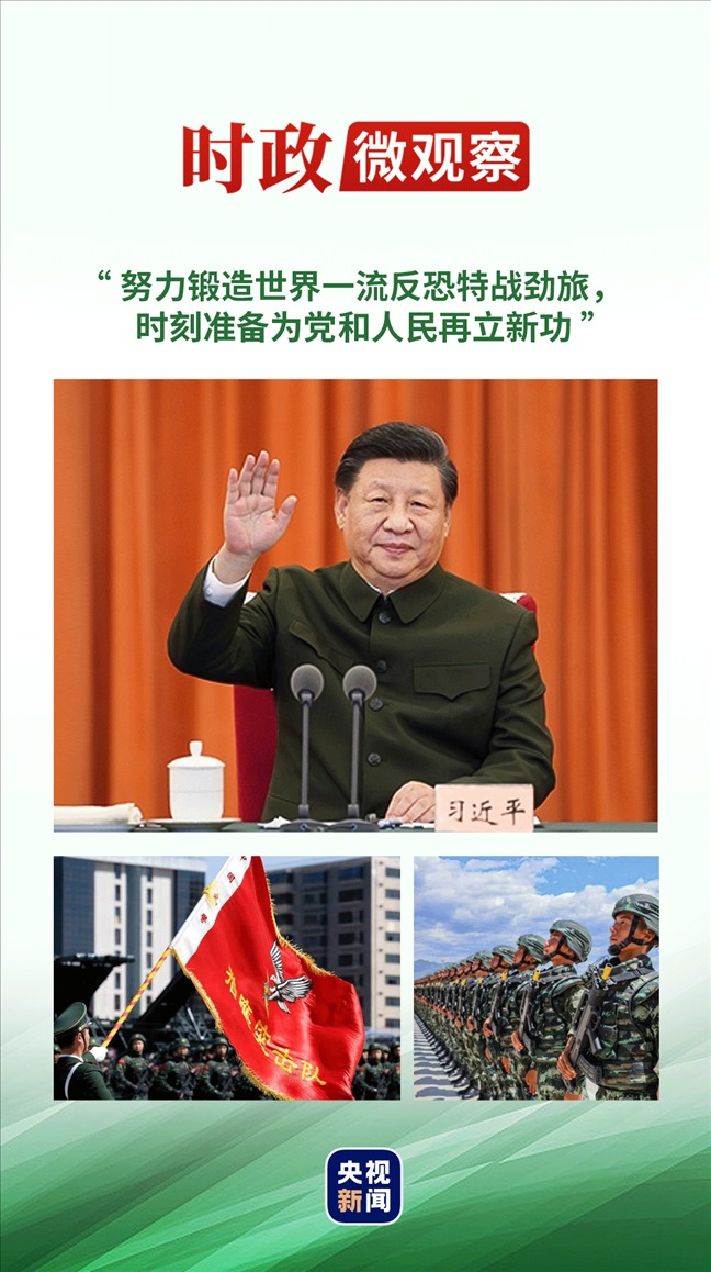 “得知10年來(lái)你們堅(jiān)定舉旗鑄魂,苦練特戰(zhàn)本領(lǐng),很好完成了擔(dān)負(fù)的任務(wù),我感到很高興?!绷?xí)近平主席再次寄語(yǔ),“希望你們?cè)俳釉賲?,不斷錘煉忠誠(chéng)品格,加強(qiáng)實(shí)戰(zhàn)化針對(duì)性訓(xùn)練,發(fā)揚(yáng)一不怕苦、二不怕死戰(zhàn)斗精神,努力鍛造世界一流反恐特戰(zhàn)勁旅,時(shí)刻準(zhǔn)備為黨和人民再立新功。”