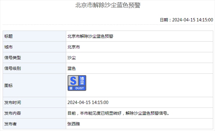 4月15日14時(shí)15分,北京市解除沙塵藍(lán)色預(yù)警:目前,本市能見度已明顯轉(zhuǎn)好,解除沙塵藍(lán)色預(yù)警信號(hào)。