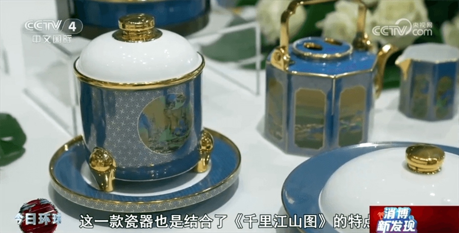 江西省景德鎮(zhèn)市商務局工作人員章少聰介紹稱:“這一幅畫是北宋王希孟先生創(chuàng)作的,叫作《千里江山圖》。這一款瓷器也是結合了《千里江山圖》的特點,把中國傳統(tǒng)畫中的山水、花鳥都完全在瓷器上面展現出來?!?/p>