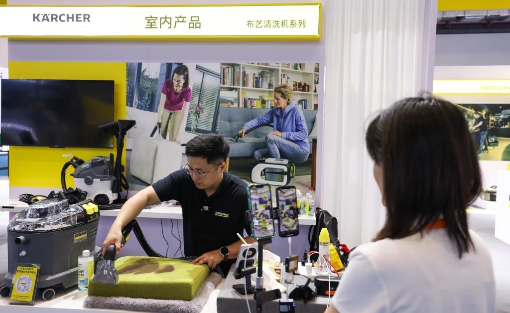 4月14日,德國(guó)卡赫工作人員在消博會(huì)上進(jìn)行直播。新華社記者楊冠宇 攝