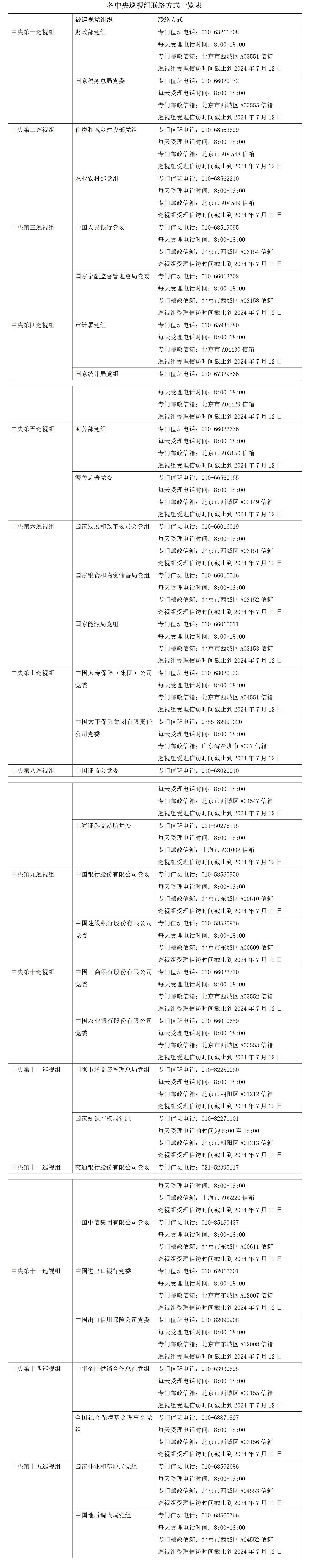 根據(jù)黨中央關(guān)于巡視工作統(tǒng)一部署,二十屆中央第三輪巡視的15個(gè)巡視組陸續(xù)開(kāi)始進(jìn)駐被巡視單位。目前,中央巡視組已進(jìn)駐31家單位并公布了聯(lián)系方式。據(jù)了解,中央巡視組將在被巡視黨組織工作3個(gè)月左右。