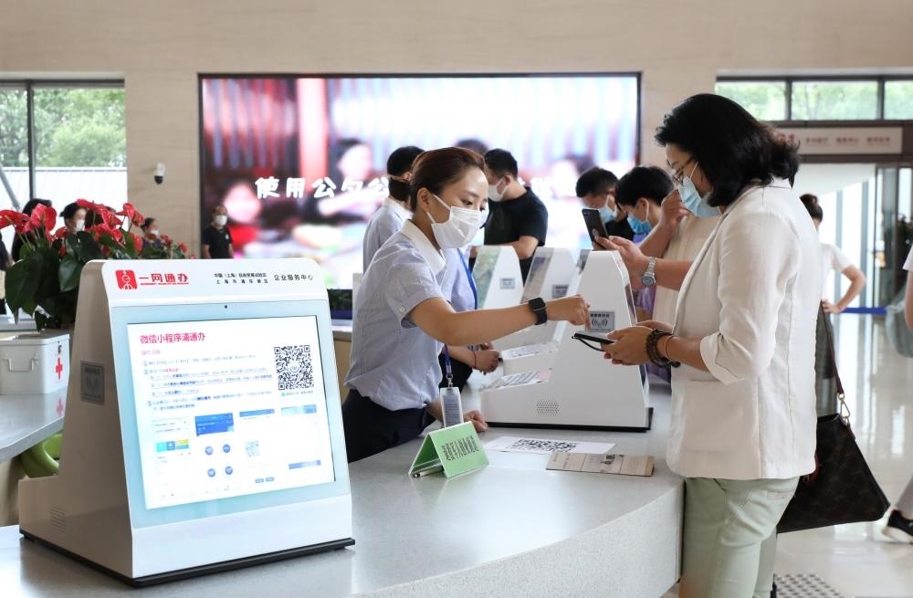 上海市浦東新區(qū)2019年率先啟動(dòng)“一業(yè)一證”改革。這是在浦東新區(qū)企業(yè)服務(wù)中心辦事大廳,工作人員指導(dǎo)市民通過手機(jī)小程序辦理一網(wǎng)通辦業(yè)務(wù)(2020年8月4日攝)。