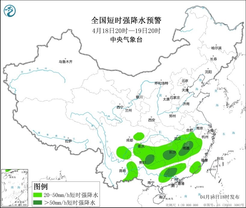 預(yù)計4月18日20時至19日20時,貴州中東部、湖南中南部、江西、浙江西南部、廣西北部、廣東北部、福建南部等地的部分地區(qū)將有8-10級雷暴大風(fēng)或冰雹天氣,其中貴州東部、湖南中南部、江西中北部、廣西東北部、廣東北部等地的部分地區(qū)將有10級以上雷暴大風(fēng),局地風(fēng)力可達11級以上;四川東部和南部、重慶南部、貴州、湖北東南部、安徽南部、湖南、江西、浙江西部、福建西北部和南部、云南東南部、廣西東北部、廣東北部等地將有小時雨量大于20毫米的短時強降水天氣,其中貴州東部、湖南中南部、江西中部、廣東中北部等地的部分地區(qū)最大小時雨量大于50毫米,局地可達70毫米以上。