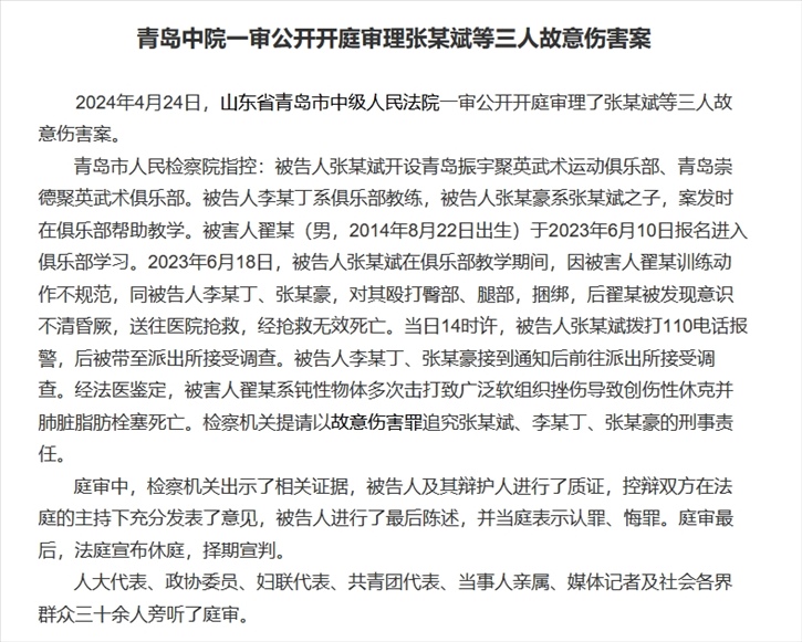 ·青島8歲男童武術(shù)俱樂(lè)部被毆打致死案4月24日開庭,將擇期判。