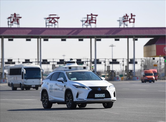一輛自動(dòng)駕駛車(chē)行駛在北京大興國(guó)際機(jī)場(chǎng)到亦莊的自動(dòng)駕駛線路上(2024年3月1日攝)。新華社記者 鞠煥宗攝