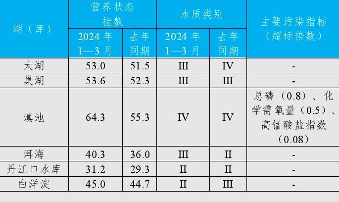 1—3月,監(jiān)測(cè)的201個(gè)重點(diǎn)湖(庫(kù))中,水質(zhì)優(yōu)良(Ⅰ—Ⅲ類)湖庫(kù)個(gè)數(shù)占比82.1%,同比上升1.1個(gè)百分點(diǎn);劣Ⅴ類水質(zhì)湖庫(kù)個(gè)數(shù)占比4.5%,同比下降0.1個(gè)百分點(diǎn)。主要污染指標(biāo)為總磷、化學(xué)需氧量和高錳酸鹽指數(shù)。181個(gè)監(jiān)測(cè)營(yíng)養(yǎng)狀態(tài)的湖(庫(kù))中,中度富營(yíng)養(yǎng)的9個(gè),占5.0%;輕度富營(yíng)養(yǎng)的31個(gè),占17.1%;其余湖(庫(kù))為中營(yíng)養(yǎng)或貧營(yíng)養(yǎng)狀態(tài)。其中,太湖和巢湖水質(zhì)均為良好、輕度富營(yíng)養(yǎng);滇池為輕度污染、中度富營(yíng)養(yǎng),主要污染指標(biāo)為總磷、化學(xué)需氧量和高錳酸鹽指數(shù);洱海水質(zhì)良好、中營(yíng)養(yǎng);丹江口水庫(kù)和白洋淀水質(zhì)均為優(yōu)、中營(yíng)養(yǎng)。