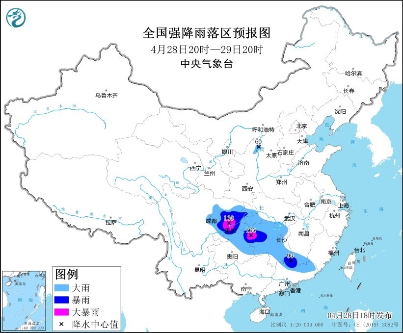 預計,4月28日20時至29日20時,湖北西南部、湖南大部、江西南部、四川盆地中東部、重慶大部、貴州東部、廣東北部等地部分地區(qū)有大到暴雨,其中,湖南西部、四川盆地東部、重慶東南部和西南部、貴州東北部等地部分地區(qū)有大暴雨(100~160毫米)。上述部分地區(qū)伴有短時強降水(最大小時降雨量30~60毫米,局地可超過80毫米),局地有雷暴大風或冰雹等強對流天氣。