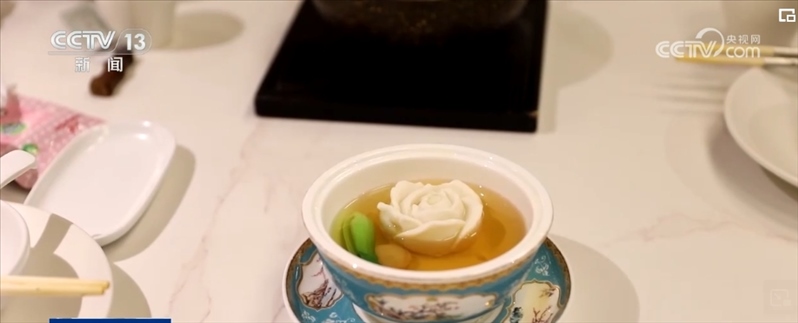 不僅僅是氛圍的打造,菜品創(chuàng)意也在還原原著中十二道菜品的基礎(chǔ)上,再對其進行創(chuàng)新和延伸, “可卿山藥棗泥糕”“鳳姐火腿肘子”“寶釵胭脂鵝”等獨具紅樓特色的菜品,都可以在這里吃到。這朵以假亂真的花朵是這里的一道招牌菜,由魚茸制作而成的“黛玉傳花”,來自上海的房阿姨對這道菜尤為喜愛。