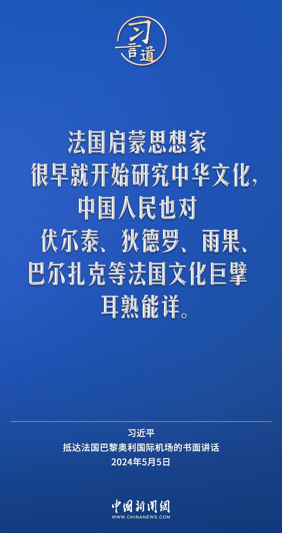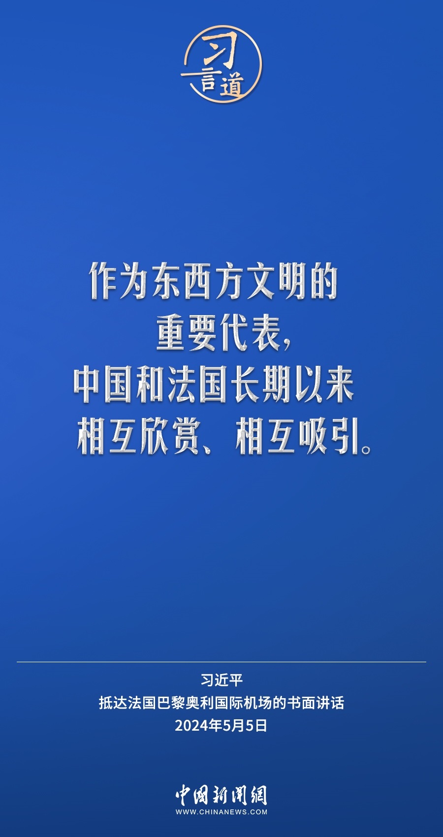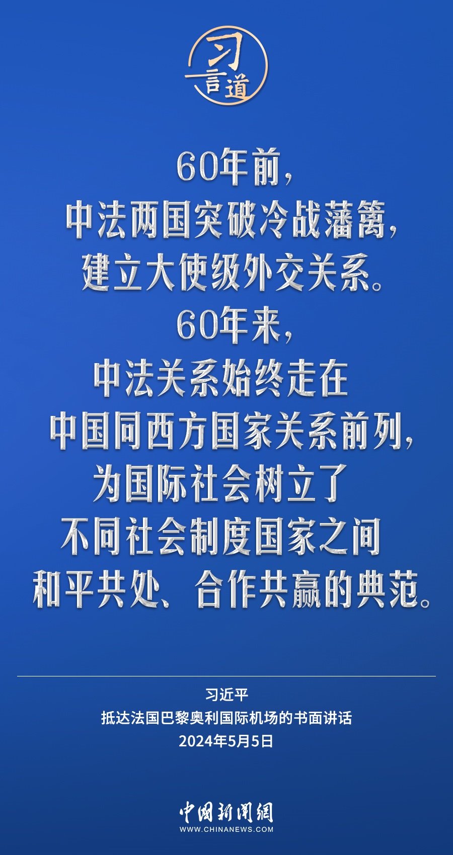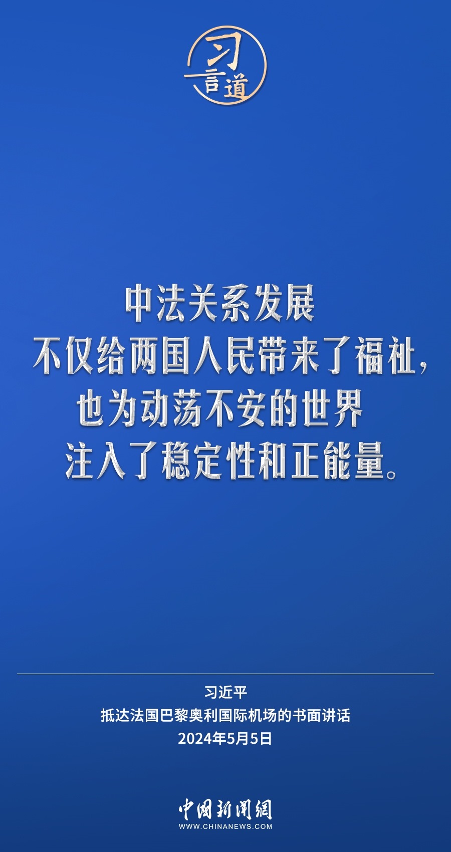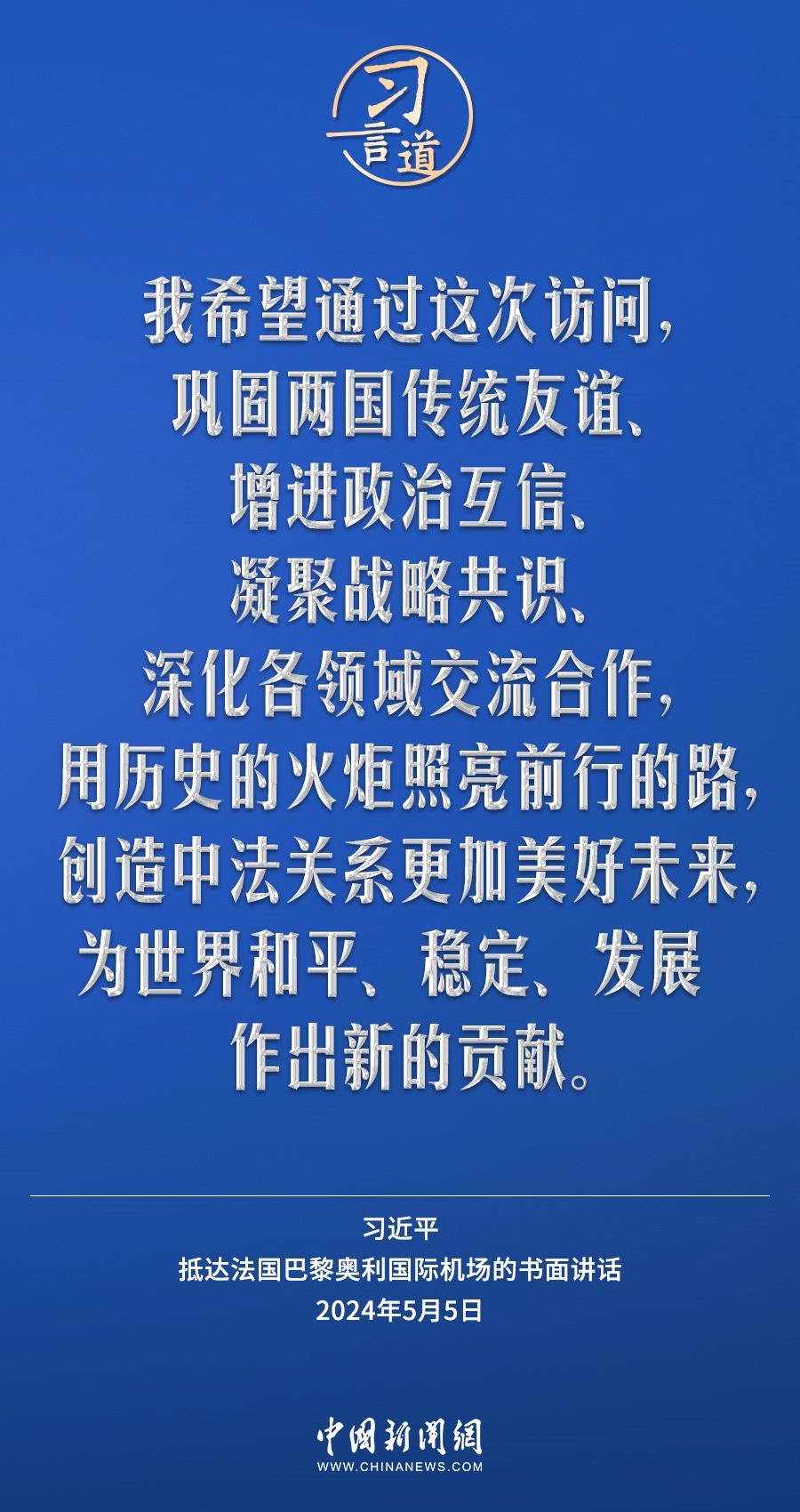 當(dāng)?shù)貢r(shí)間5月5日下午,國(guó)家主席習(xí)近平抵達(dá)巴黎,開(kāi)始對(duì)法國(guó)進(jìn)行國(guó)事訪問(wèn)。在抵達(dá)法國(guó)巴黎奧利國(guó)際機(jī)場(chǎng)的書(shū)面講話(huà)中,習(xí)近平指出——