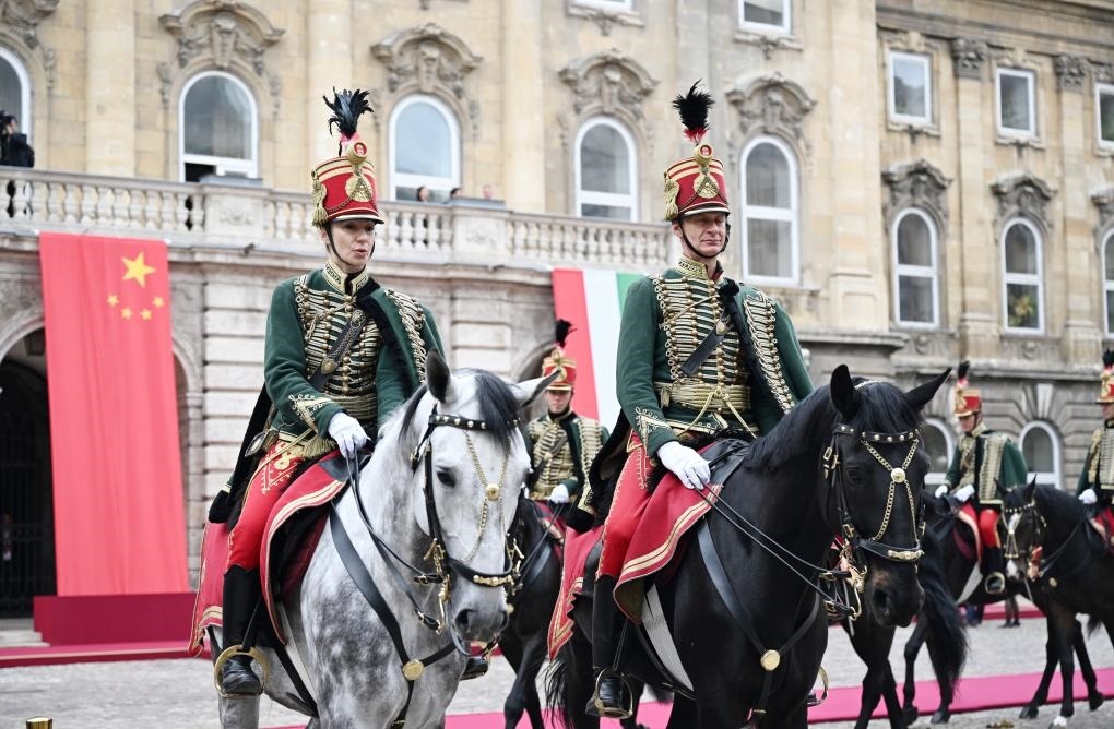 當(dāng)?shù)貢r(shí)間5月9日上午,國家主席習(xí)近平在布達(dá)佩斯出席匈牙利總統(tǒng)舒尤克和總理歐爾班共同舉行的隆重歡迎儀式。習(xí)近平在舒尤克陪同下檢閱國防軍儀仗隊(duì)和騎兵儀仗隊(duì)。