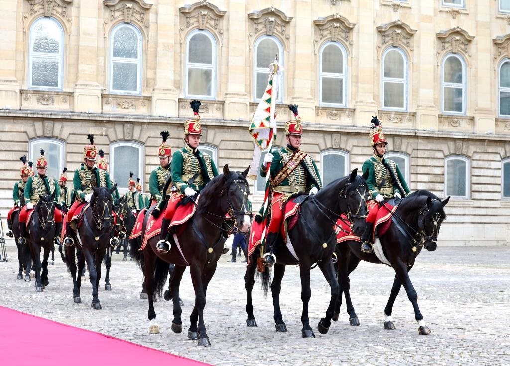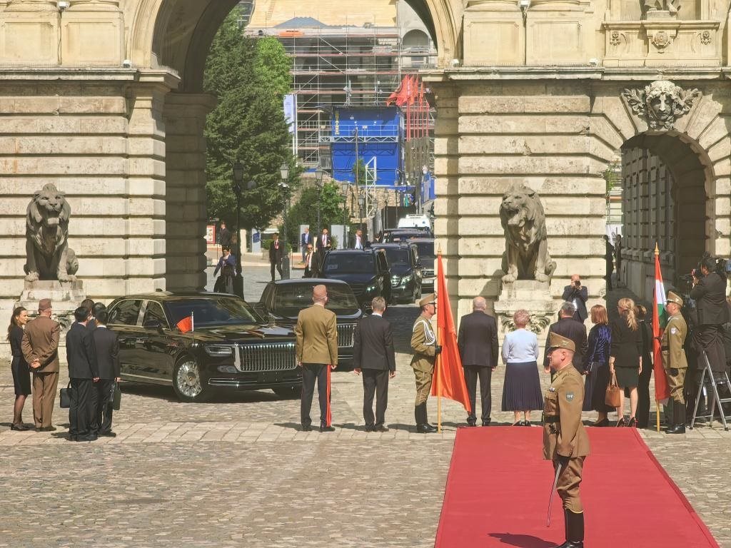 初夏時(shí)節(jié)的布達(dá)佩斯陽光明媚,古老宏偉的布達(dá)王宮莊嚴(yán)矗立,中匈兩國國旗相映成輝。習(xí)近平和夫人彭麗媛乘坐的國賓車隊(duì)在匈牙利禮賓馬隊(duì)護(hù)衛(wèi)下緩緩駛?cè)氩歼_(dá)王宮內(nèi)庭。舒尤克總統(tǒng)夫婦和歐爾班總理夫婦熱情迎接。