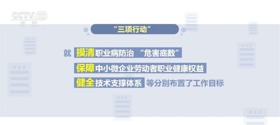 “三項(xiàng)行動”工作方案包括《職業(yè)病危害項(xiàng)目申報(bào)擴(kuò)面行動(2024—2025年)工作方案》《中小微企業(yè)職業(yè)健康幫扶行動(2024—2025年)工作方案》《職業(yè)病防治機(jī)構(gòu)提質(zhì)合規(guī)行動(2024—2025年)工作方案》。