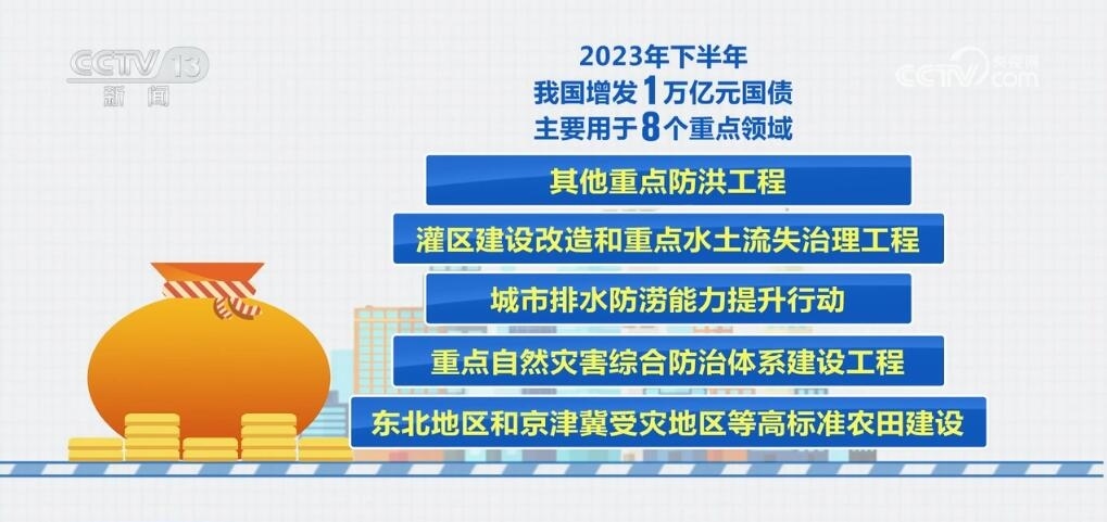 去年下半年,我國(guó)增發(fā)了1萬億元國(guó)債,主要用于8個(gè)重點(diǎn)領(lǐng)域,包括:災(zāi)后恢復(fù)重建,支持以京津冀為重點(diǎn)的華北地區(qū)等災(zāi)后恢復(fù)重建和提升防災(zāi)減災(zāi)能力,促進(jìn)災(zāi)區(qū)基本生產(chǎn)生活條件和經(jīng)濟(jì)發(fā)展恢復(fù)到災(zāi)前的水平;以海河、松花江流域等北方地區(qū)為重點(diǎn)的骨干防洪治理工程;自然災(zāi)害應(yīng)急能力提升工程;其他重點(diǎn)防洪工程;灌區(qū)建設(shè)改造和重點(diǎn)水土流失治理工程;城市排水防澇能力提升行動(dòng);重點(diǎn)自然災(zāi)害綜合防治體系建設(shè)工程;東北地區(qū)和京津冀受災(zāi)地區(qū)等高標(biāo)準(zhǔn)農(nóng)田建設(shè)。
