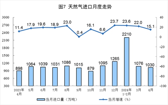 1—4月份,規(guī)上工業(yè)天然氣產(chǎn)量830億立方米,同比增長(zhǎng)5.0%。進(jìn)口天然氣4300萬噸,同比增長(zhǎng)20.7%。