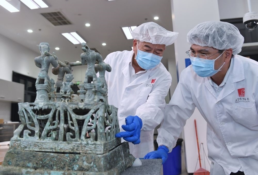 2023年5月30日,在四川三星堆博物館文物保護(hù)和修復(fù)中心,三星堆博物館陳列保管部副部長郭漢中(左)與同事討論神壇底座修復(fù)方案。