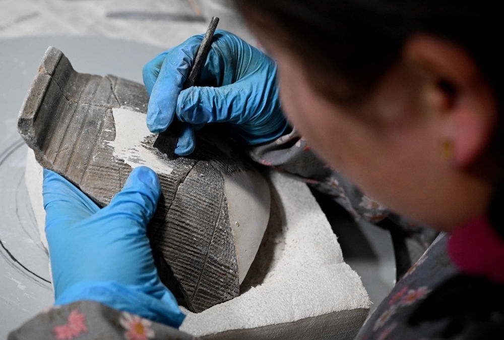 2024年2月23日,在中國社會(huì)科學(xué)院考古研究所安陽工作站,工作人員在整理修復(fù)殷墟洹北商城出土的陶片。