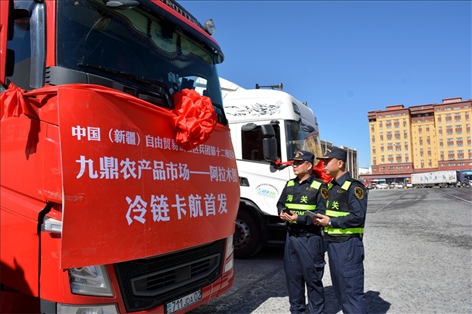 5月10日,一輛滿載蘋果的冷鏈運(yùn)輸車從烏魯木齊市發(fā)車前往哈薩克斯坦阿拉木圖市。這是新疆首次實(shí)現(xiàn)果蔬冷鏈卡航直達(dá)中亞市場(chǎng)。圖為烏昌海關(guān)關(guān)員對(duì)冷鏈卡航模式出口鮮蘋果進(jìn)行驗(yàn)放。楊逸萌攝