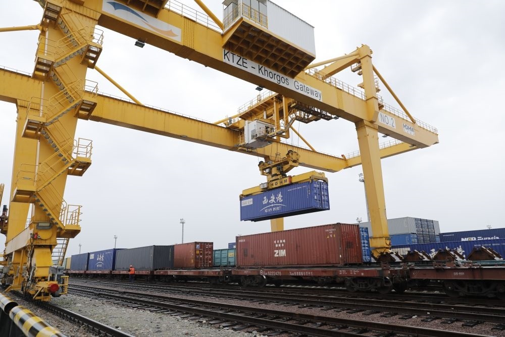 2022年5月19日,在哈薩克斯坦南部中哈邊境地區(qū)的“霍爾果斯-東大門”無水港內(nèi),龍門吊正在工作。新華社發(fā)(奧斯帕諾夫攝)