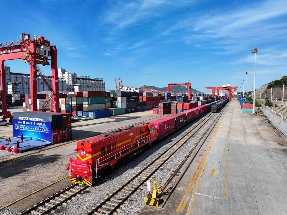 2024年6月26日,在中哈連云港物流合作基地,“韓國-連云港-中亞”國際多式聯(lián)運班列靜待開行(無人機照片)。