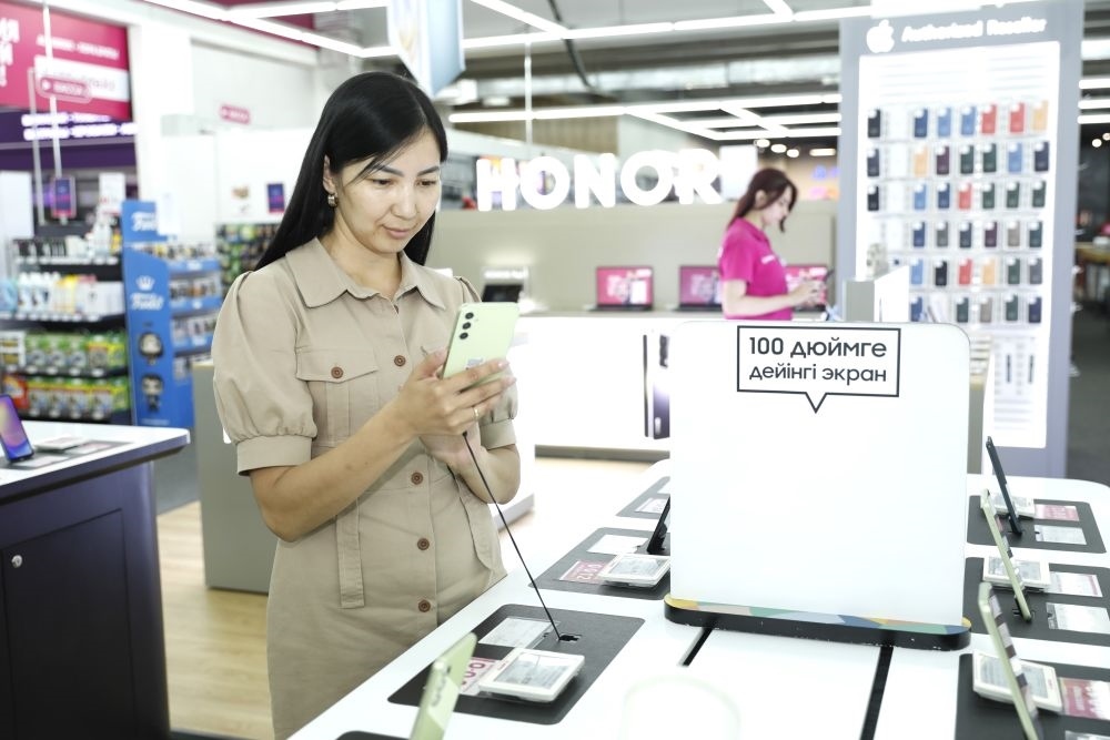 2024年7月1日,顧客在哈薩克斯坦阿斯塔納試用中國品牌手機。新華社發(fā)(奧斯帕諾夫攝)