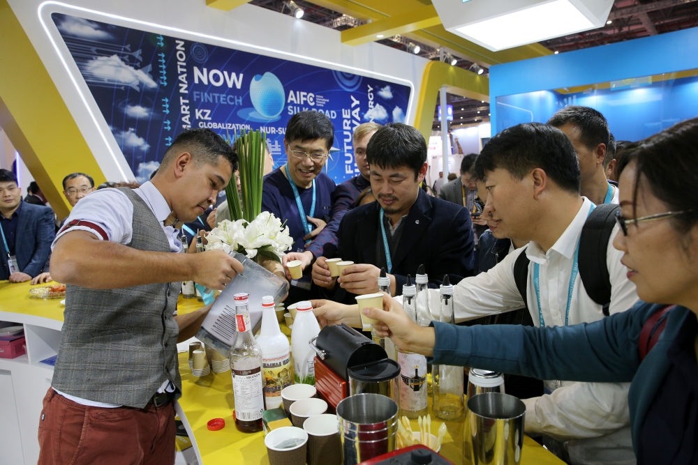 2019年11月6日,在上海進博會哈薩克斯坦國家館,調(diào)酒師為參觀者分享雞尾酒。