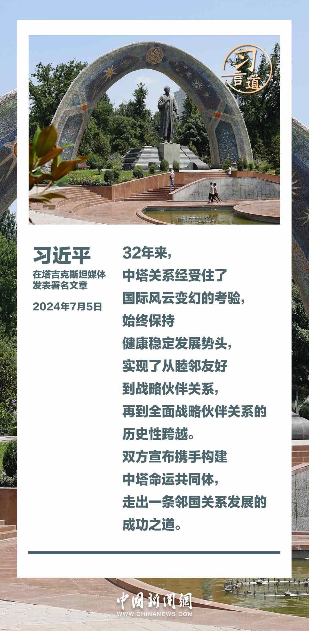 7月5日,在對(duì)塔吉克斯坦進(jìn)行國事訪問之際,國家主席習(xí)近平在塔吉克斯坦《人民報(bào)》和“霍瓦爾”國家通訊社發(fā)表題為《共創(chuàng)中塔關(guān)系美好明天》的署名文章。習(xí)近平指出——