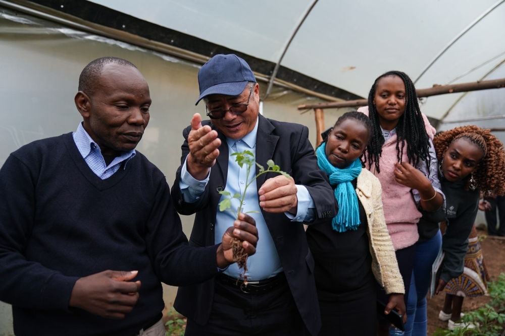 2023年9月18日,在肯尼亞納庫魯郡舉辦的中非農(nóng)業(yè)發(fā)展和減貧示范村番茄生產(chǎn)培訓(xùn)班上,來自中國的農(nóng)學(xué)教授劉高瓊(左二)為肯方學(xué)員指導(dǎo)農(nóng)業(yè)技術(shù)。多年來,中國農(nóng)業(yè)專家在當(dāng)?shù)亻_展了知識培訓(xùn)、技術(shù)指導(dǎo)和農(nóng)業(yè)設(shè)施修繕等工作,有效助力中國先進(jìn)的農(nóng)業(yè)技術(shù)在納庫魯?shù)貐^(qū)的示范推廣,幫助農(nóng)民實(shí)現(xiàn)增收減貧的目標(biāo)。
