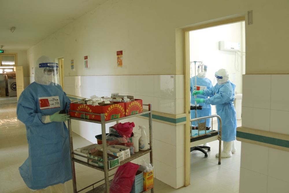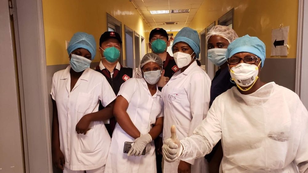 2020年5月26日,在剛果(布)首都布拉柴維爾,中國抗疫醫(yī)療專家組與當(dāng)?shù)匾痪€醫(yī)務(wù)人員交流,指導(dǎo)新冠肺炎病房建設(shè)。