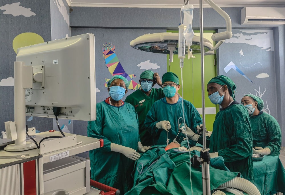 2022年10月26日,中國援坦桑尼亞醫(yī)療隊小兒外科醫(yī)生丁國建(中)在坦桑尼亞達(dá)累斯薩拉姆的穆欣比利國立醫(yī)院實施小兒腹腔鏡手術(shù)(手機照片)。