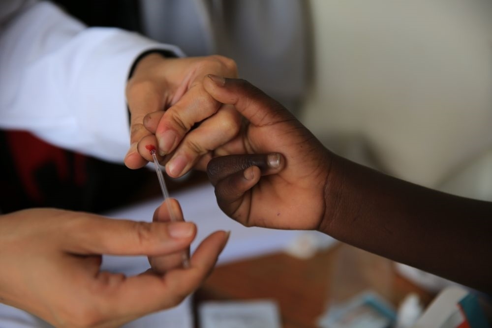 2018年12月8日,在馬拉維南部布蘭太爾市卡迪迪村衛(wèi)生院,第六批中國援馬拉維醫(yī)療隊醫(yī)生在義診活動中為當(dāng)?shù)鼐用駲z測瘧疾。